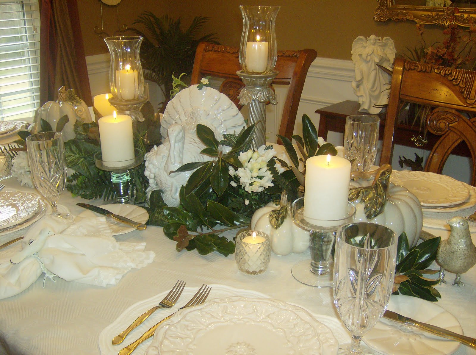 Another warm and inviting room. The mantel decor is simple but beautiful. I love the use of white magnolias.