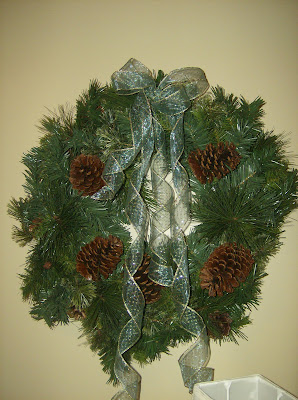 A simple pine wreath hangs on the wall by the bedroom door. It's only ornamentation is the natural pinecones and a sheer blue and gold ribbon.